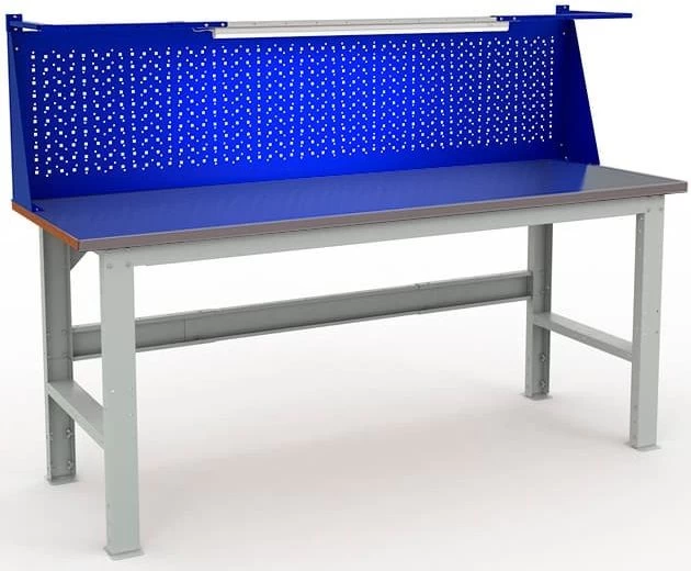 - Верстак можно дополнить такими аксессуарами, как перфорированный экран, различные держатели, полки, блок розеток, диодное освещение.