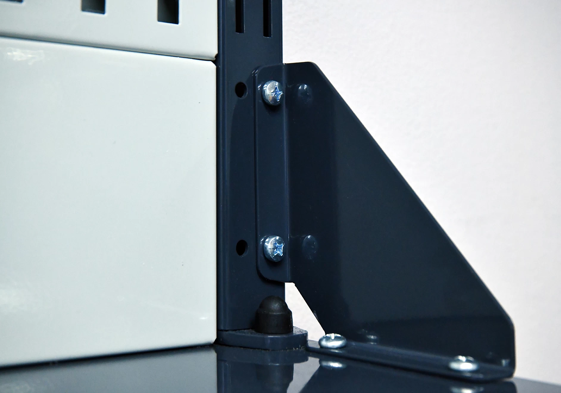 Несущий каркас верстака изготовлен из профилированной холоднокатаной стали высокой прочности, что придаёт ему особую устойчивость и позволяет выдерживать распределённую нагрузку до 1500 кг. Опоры допускают частичную регулировку по высоте, что делает возможным разместить верстак даже на неровном покрытии. Внутри опор установлены боковые перфорированные панели.
